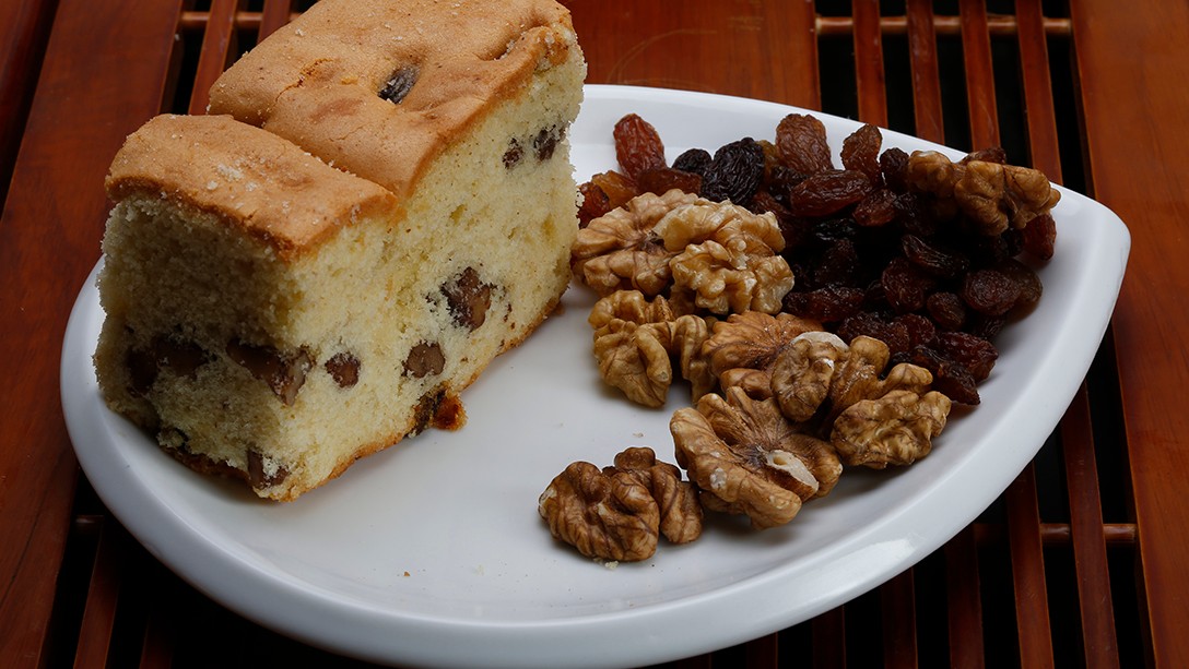 主料:雞蛋、小麥粉、白砂糖、核桃仁、葡萄干、起酥油